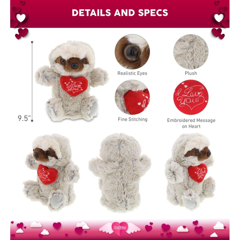 - INCLUDED WITH THE PURCHASE - Includes 1 DolliBu Sloth Super Soft Plush Hand Puppet stuffed toy measuring about 9.5" inches with a romantic message. The Sloth plush animal hand puppet comes with a red stuffed heart attached featuring a beautifully embroidered "I Love You" message. Then for an additional cost, you have the option to add, Gift Bag, Tissue Paper, Greeting Card, and Personalize with a name.