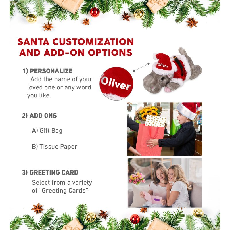 - PERSONALIZATION, CUSTOMIZATION, ADD-ON OPTIONS - Stuffed hippo plush comes customized with a Santa Claus red outfit. You can personalize it with the name of your loved one, which we'll imprint on the item. You also have the option to add some or all of the cool add-ons to make it special: 1) Red, Pink, or Blue Gift Bag; 2) Gold Hearts, Red Hearts or Gold Stars Tissue Paper; 3) Greeting Card: Merry Christmas, Get Well, Happy Birthday, I Love You