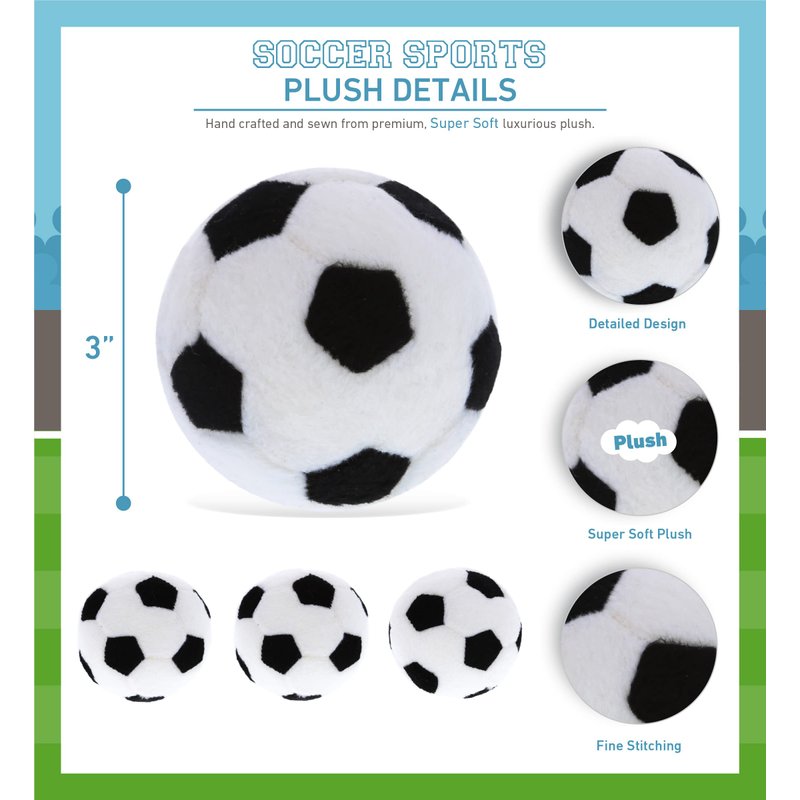- INCLUDED IN THE PURCHASE OF SOFT SOCCER BALL TOY - Includes 1 Small Super Soft Plush Soccer Ball made with realistic embroidery design. Soft soccer ball for kids' body is covered in fluffy black and white fluffy plush, making the plush great for display in a girl or boy sports room. Great design stitched on the squishy balls for kids makes the best soccer gifts. The soccer toy sports balls plush measures 3 inches, perfect size for little hands.