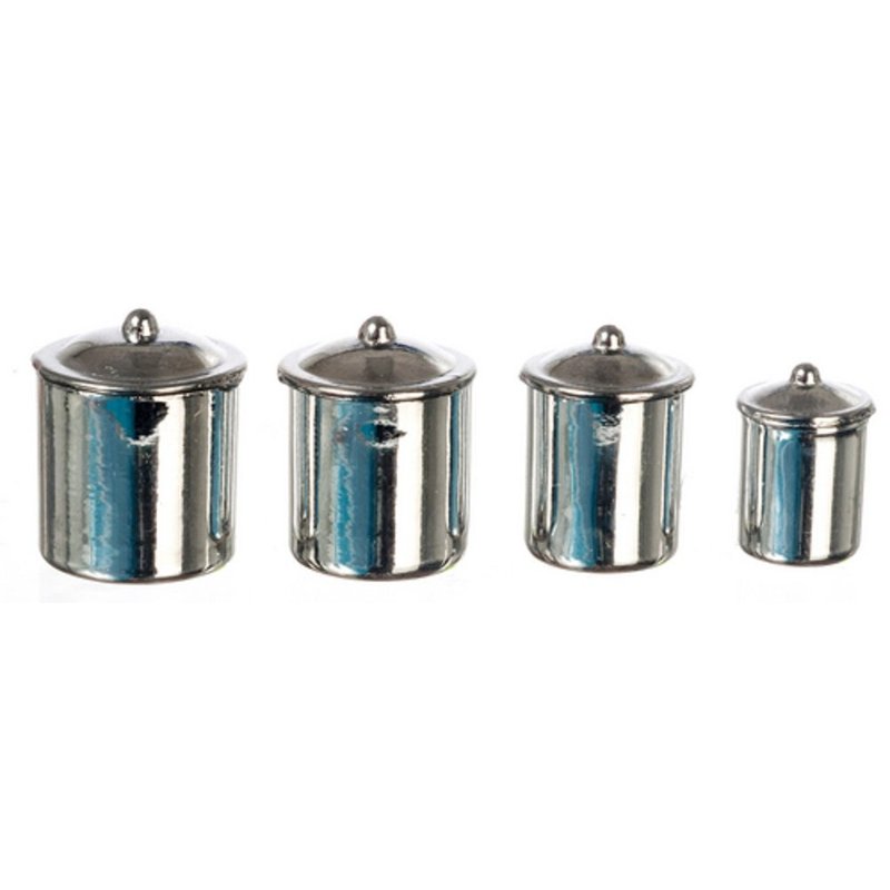 This set of 4 stainless steel canisters with removable lids would make a wonderful addition to your miniature home. Dimensions, ea: 1 at 13/16"H x 9/16" diameter. 1 at 3/4"H x 1/2" diameter. 1 at 5/8"H x 3/8" diameter. 1 at 9/16"H x 5/16" diameter. 1" to 1'. 1:12 Scale. This is sized for a dollhouse. Detailed scale model for adult collectors. Not intended for children under 14.