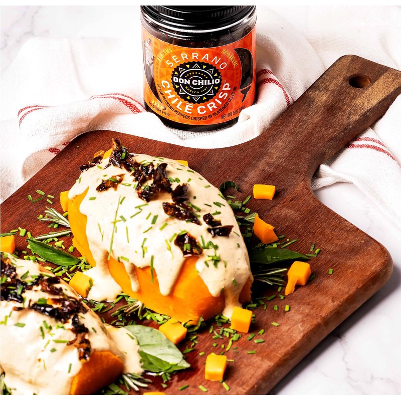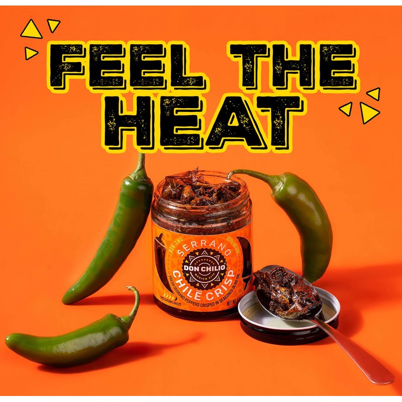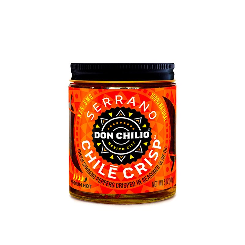 - MEDIUM CHILE CRISP TOPPING: Don Chilio’s Medium Mexican Chile Crisp contains selected premium Serrano chiles at their peak of ripeness. The medium mexican chili crisp flavor has a crunchy texture that adds a medium kick to your meal.