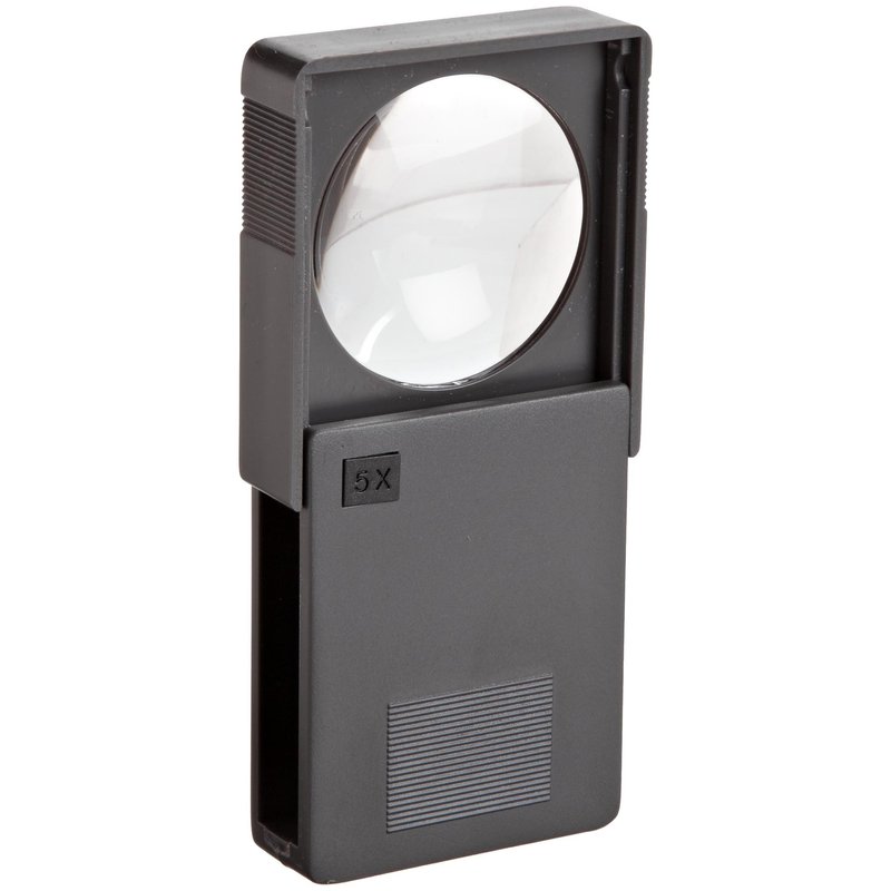 - Slide-out magnifying lens in a plastic case