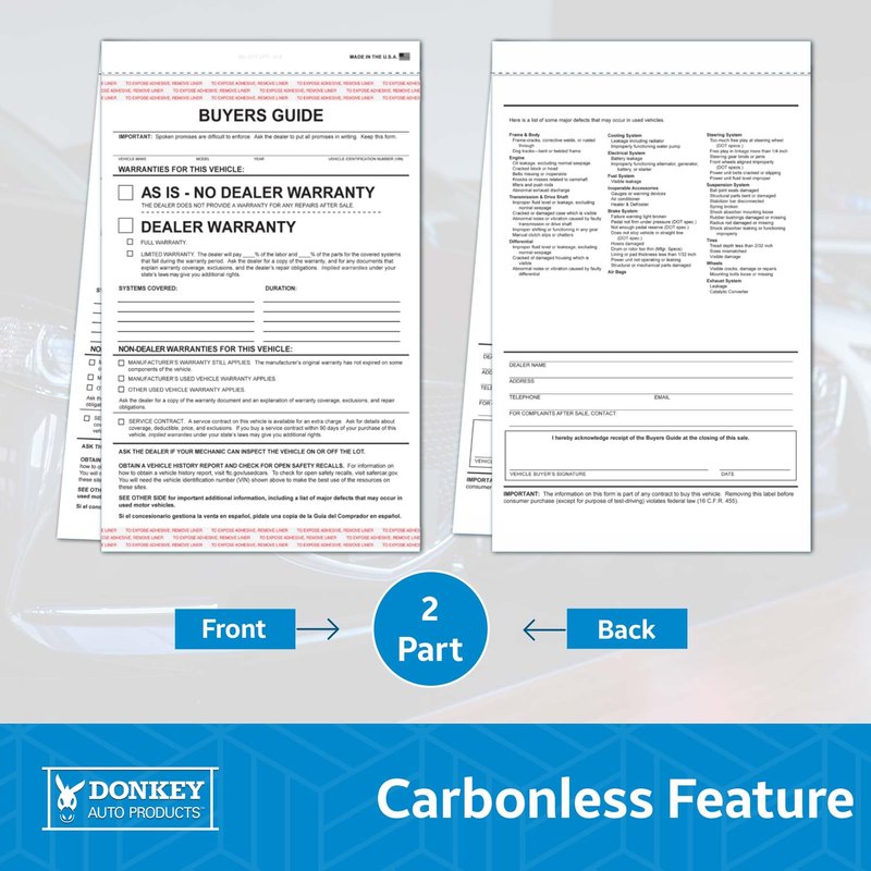 Revolutionize Your Dealership With Our 2-Part Buyers Guide Form - The vehicle buying process can often be a complicated affair. Our Vehicle Warranty Information Form is designed to simplify the process, ensuring a smooth and hassle-free experience for both the buyer and the seller. These forms serve as a comprehensive document, covering all necessary information regarding the car warranty, thus fostering a trustful relationship between the dealer and the customer. Our Auto Dealership Form stands out due to its carefully considered dimensions of 7.33 x 11.75 inches. The size allows it to fit perfectly into any workflow, ensuring that it does not disrupt your daily operations. It is printed in bold, black ink, ensuring the text is clear, legible, and difficult to alter. This eliminates any room for misunderstandings or discrepancies. Standard buyers guide text is on the back. The Car Warranty Form is designed with convenience in mind. It features adhesive tape at the top and bottom, allowing it to be securely attached to the inside of a vehicle window. It is also 2-part carbonless, meaning it provides clean and clear copies, eliminating the need for manual entries and reducing the risk of errors. One of the standout features of our Automotive Sales Document is the detailed content. The main text area features 'As Is - No Dealer Warranty / Dealer Warranty,' offering complete transparency and protection for all parties involved. It also includes lines for additional warranty text and Non-Dealer Warranties, catering to all potential scenarios. Last but not least, the Used Car Warranty Form comes in packs of 100, offering optimal convenience and easy storage. This makes it ideal for busy dealerships that handle a high volume of transactions. In addition, it is compatible with Form # BG-2017-2PT-AI-E, ensuring consistency across your documents.