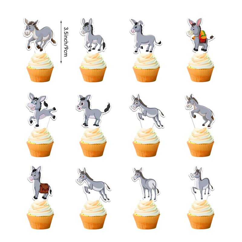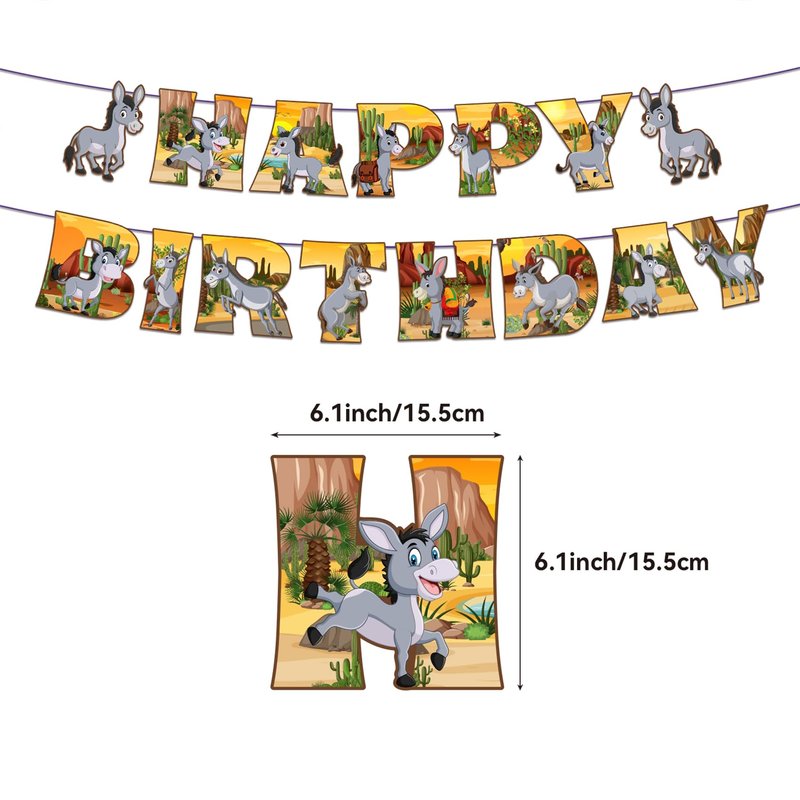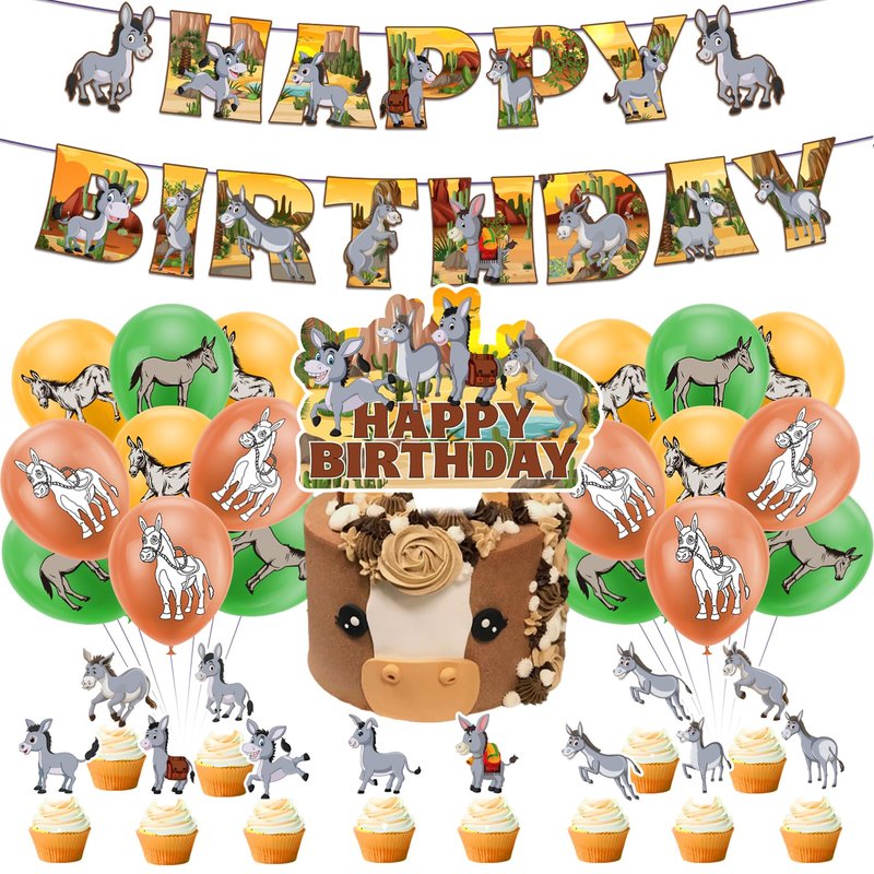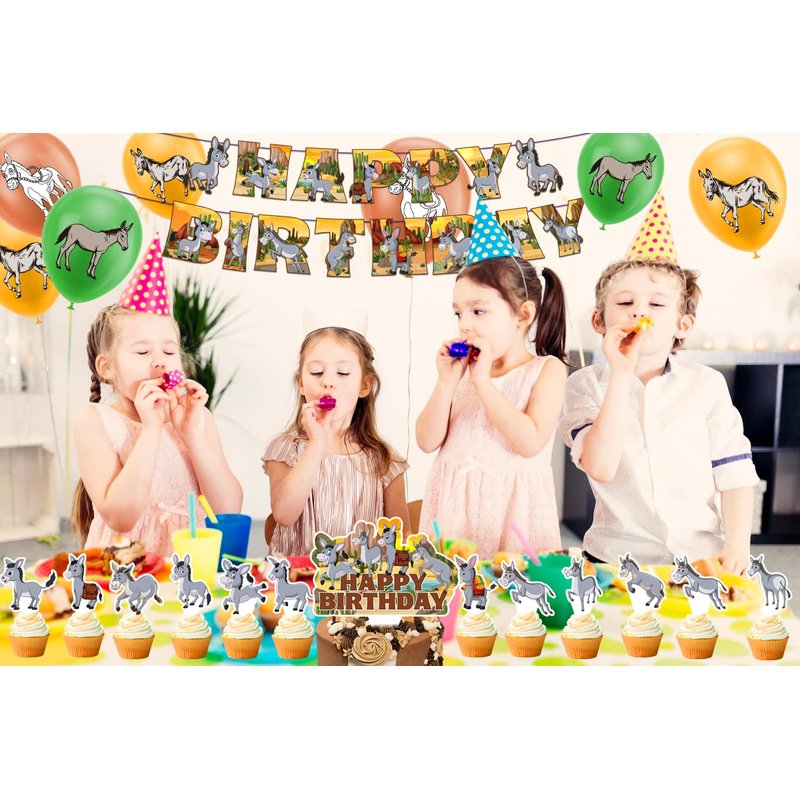 - Donkey Party Supplies: Package includes 1 * donkey HAPPY BIRTHDAY banner, 1 * donkey happy birthday cake topper, 12 * donkey cupcake toppers, 18 * donkey balloons, 1 ribbon.Sufficient quantity to meet your decoration needs.
