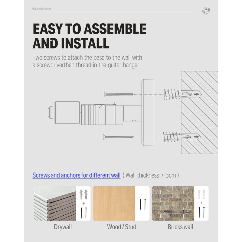 The Donner wall mount guitar hanger is uniquely designed with a deep cradle and auto locking gate. Lock your guitar automatically when putting guitar neck on the arm. And Automatically release when lifting your guitar. Extremely convenient comparing to traditional manual locking. Secure the instrument neck inside support arm, protects your instrument from dropping of the hanger. This means that not only is this guitar hanger compatible with all types of guitars but it also adapts to your environment, withstanding pressure from all directions, providing you with Peace of mind and your pride and joy, with the security that it deserves. And helps you to save more space in your room. It makes getting guitar up and down easier, more convenient to play. Suitable for a variety of string instruments such as acoustic guitar, classic guitar, electric guitar, bass, banjo, mandolin and so on.