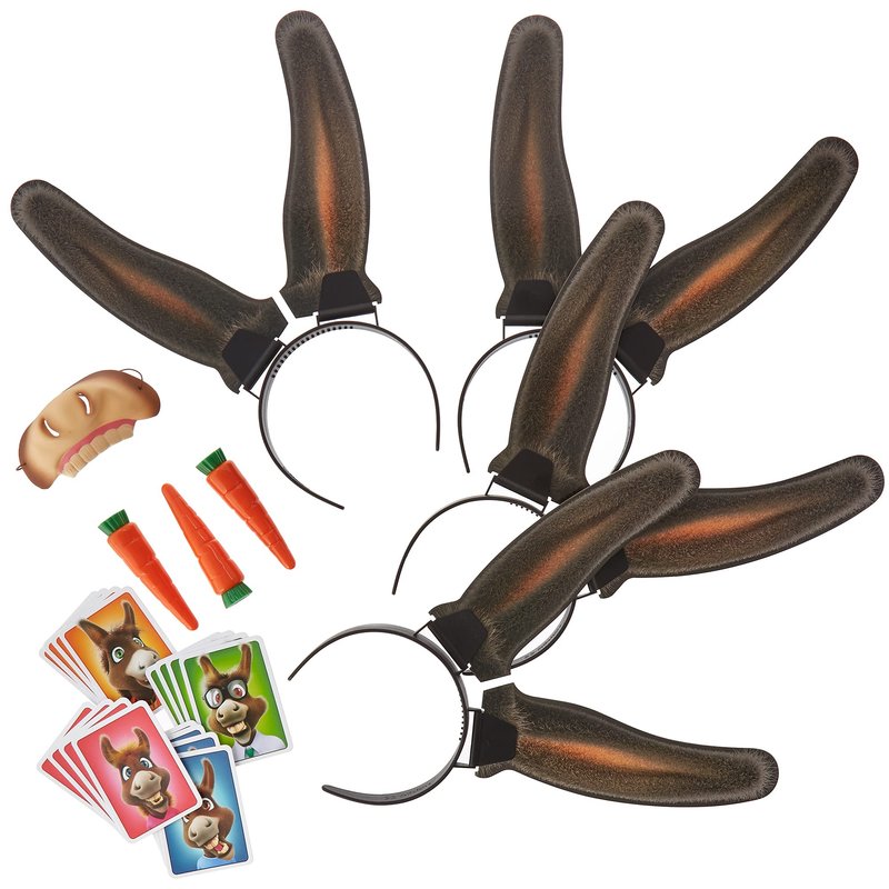 - 2-4 Players: Comes with 4 decks of playing cards, 4 headbands each with their own set of foldable ears, three plastic carrots, and one rubber donkey nose with a stretchy band