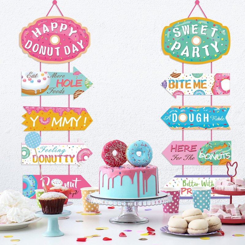 This donut banners are great decorations to your donut dessert theme party, baby shower,birthday party, 1st birthday party, wedding ceremony, and other occasions need food display,such as New Year, Christmas, Thanksgiving, graduation and so on. You can hanging them to your wall,door,window,tree and the place you want to decorate.