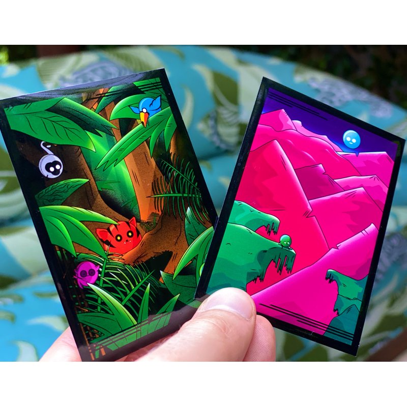Introducing Doomsleeves - the ultimate accessory for your Doomlings card game! With 300 ultra-soft and anti-slip card sleeves to protect your cards from the end of the world! (Or at least food and beverages) Designed with artwork by Justus Meyer and mirrored silver interiors, these sleeves add a touch of elegance to your Doomlings card collection, giving each card the appearance of being inside a picture frame. The green jungle back for the Trait cards and the pink moonlit landscape for the Ages makes each pack a visual delight. Each pack comes with 195 Trait sleeves, 55 Age sleeves, and 50 clear sleeves for cards that require both sides to be visible for play, including Player Aids, Gene Pools, Birth of Life, and Meaning of Life. Does not cover Overlush cards