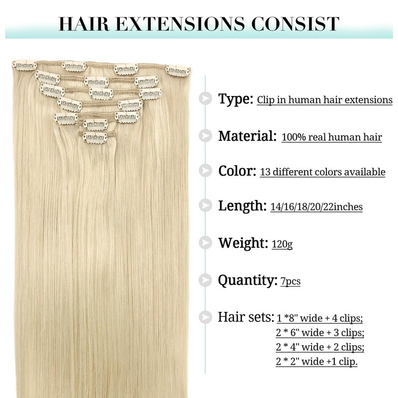 DOORES clip in hair extensions Brand purpose: Design fashionable and high-quality hair for women and girls, let them have beautiful hair, and maintain a good mood every day. Product description 1. Hair material: 100% real human hair, can be washed, curled and dyed like your own hair. 2. Hair extensions with clips: 7 pieces set 120g. 105g net weight for hair without clips, 120g for hair with clips. 3. Hair sets: 1 x 8" wide weft 4 clips attached, 2 x 6" wide weft 3 clips attached, 2 x 4" wide weft 2 clip attached, 2*2" wide weft with 1 clips. 4. Length: 14-22 inches. 5. Suitable for any occasion: Whether it is daily life or party, wedding, Christmas, etc., it is also a good gift for your female friends. 6. Texture: silk straight, can be curly waved. 7. Hair dye and curl: Choose the color similar to your hair, can be dyed to matched perfectly. It will keep the hair super condition with suitable hair care. And can be curled to any beautiful hairstyle you want. Warm hair care tips 1. Hair color: Real product picture. When you choose color, according your hair root color. Make a balayage ombre hairstyle, it will be gorgeous and amazing. Maybe due to lighting effects, monitor's brightness/contrast settings etc, there could be a little slight or dark. 2. Hair Dying: Do promise 100% real human hair extensions clip in, so it can be treated and styled like your own hair, we do not suggest dye the colorful or more light color, if you also want to do this, please go to the professional salon or contact us before you do this. Customer serive: If you have any problem, please feel free to contact us, we will help you to solve asap.