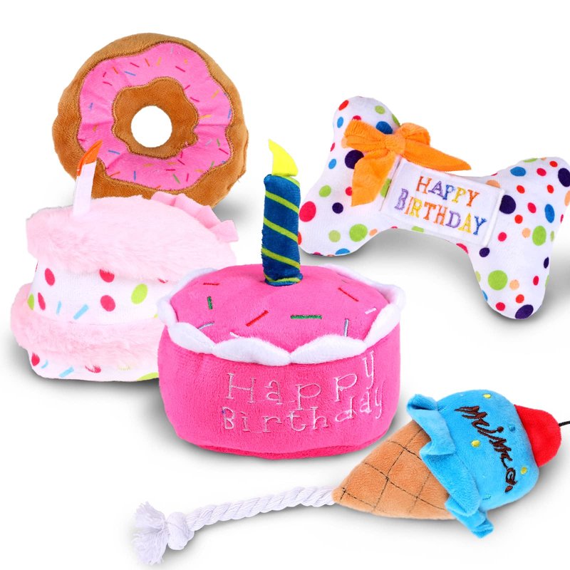 DoreenBow 5 Pack Dog Birthday Toys for Small Dogs Birthday Cake Squeaky Dog Toy Chew Toys Puppy Teething Toys Plush Birthday Box Gift for Dogs