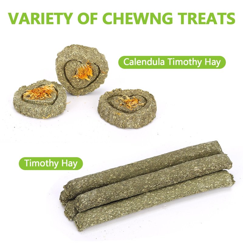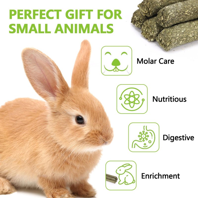 All of timothy hay sticks for guinea pig toys are handmade from 100% natural material,enrichment in nutrients healthy and harmless timothy hay for rabbit. Does not contain pigments and hormones.Our rabbit chew treats are very beneficial to small animals.(Package Included 25PCS)