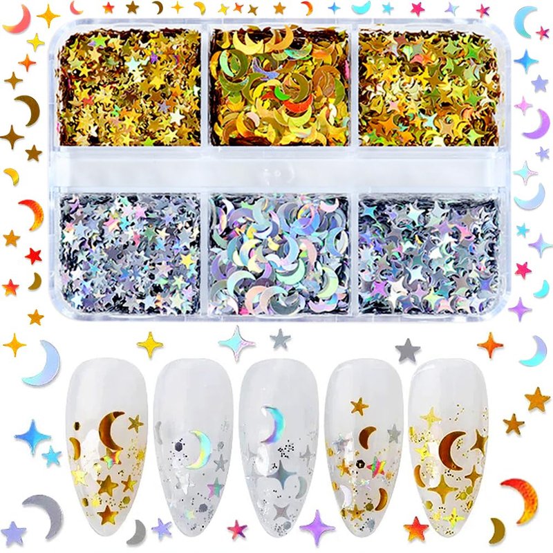 - 【Package Contain】 You Will get 1 box/6 grids of star,moon,four-pointed star nail sequins of two different sizes.6small grids are stored separately,can be applied on your nails,hair,face, body,other nail Accessories craft and so on.You can choose different designs to decorate the nails, which can enhance the gloss and create a variety of dazzling nail art designs.