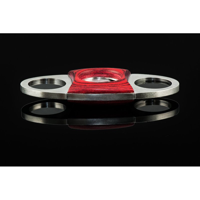 DOS CABALLOS CIGARS RED WOOD VEE HANDLE STAINLESS STEEL CIGAR CUTTER WITH SELF SHARPENING BLADES.