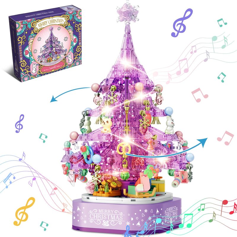 DOSCOR Purple Crystal Christmas Tree Building Blocks Set,Christmas Music Box with LED Light,Xmas Gift for Girls,Kids,and Adults