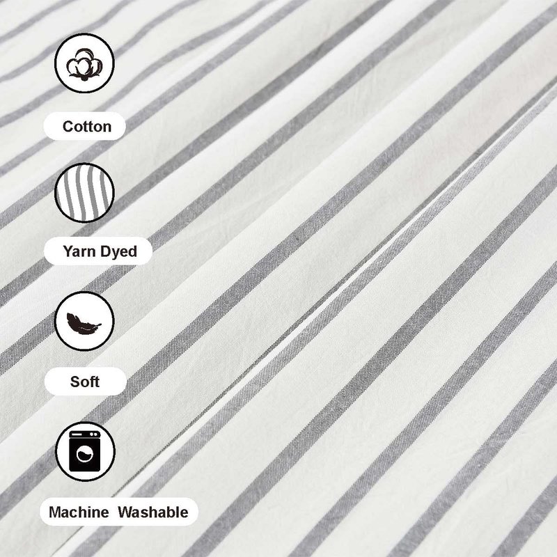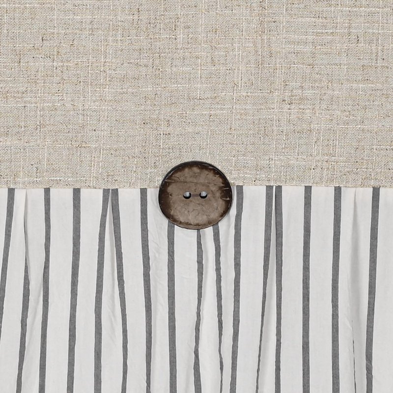 - Soft, linen and cotton blend fabric curtain with a farm house,shabby chic or country style design for your bathroom. Beige and Grey stripe shower curtain with pleats and wooden button embellishments to enhance your space.