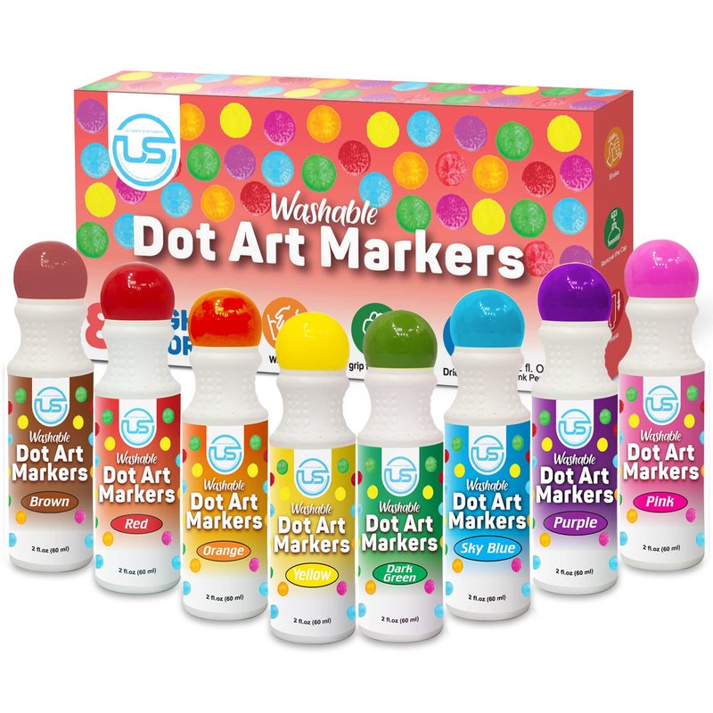 - DOT MARKERS BOX Includes 8 Bright Color Washable Dot Markers for toddler art supplies and kids of all ages to create colorful artwork.