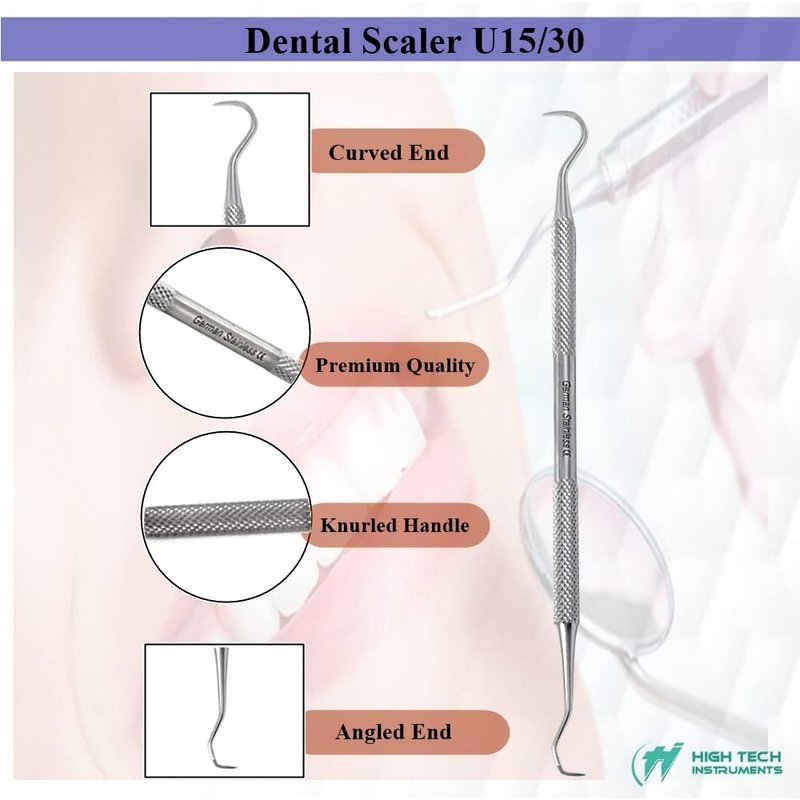 Double Ended Dental Scaler U15-30 Made of Stainless Steel Reusable Tool Plaque & Tartar Remover Pick Suitable for Professional or Personal Use & Pet Oral Hygiene Care with Knurled Handle