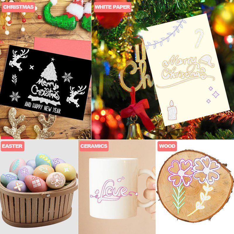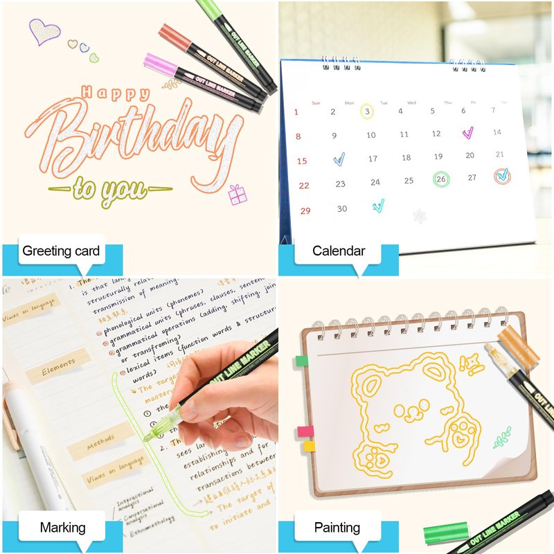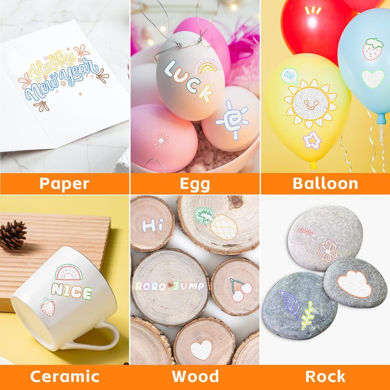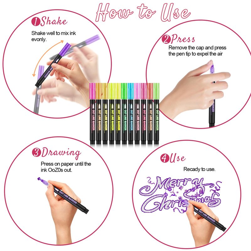 - 【Widely use】 Double line outline markers are perfect for creating artwork, drawing, doodling, card making, christmas greeting card, and suitable for most smooth surfaces like wood, canvas, ceramics, metal, stone, and glass; or using metallic outline markers painting on porous surfaces like poster paper, rocks, gift cards, canvas, and more.
