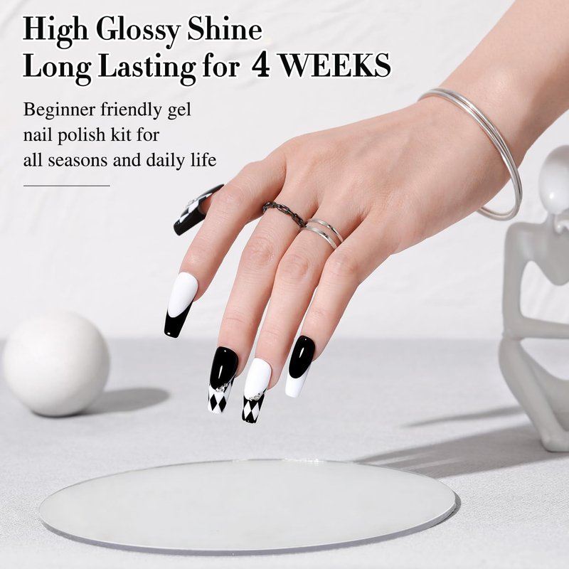 - Double Rhythm GEL POLISH: you will get 2 pcs 15ml gel nail polish with Pure white And pure black color , need to be cured under UV or LED Lamp for 60-120s. Must apply with Base Gel and Top Coat. Please shake the bottle or warm it with hot water before use, to achieve a better effect.