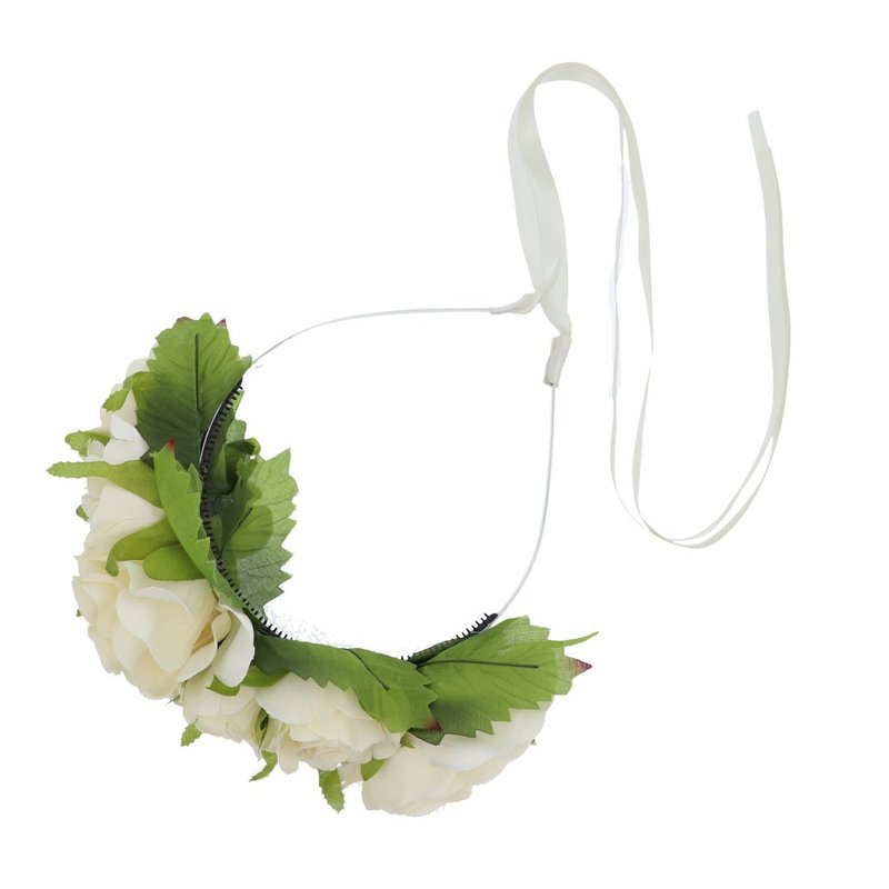 Double Rose Flower Wreath Headband with Ribbon for Women - Ivory
