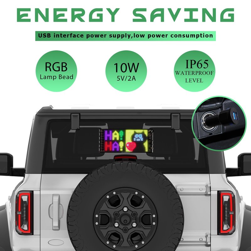 - 【Colorful Lighting】The scrolling LED sign features a unique double-row display design that can show more information simultaneously,The programmable car LED sign is a 24 X 48 pixel full-color LED display, adopts 2121 RGB lamp beads. This high-quality LED matrix panel can not only emit high-intensity light, but also with low power consumption, and the full-color effect is brighter and soft without glare.