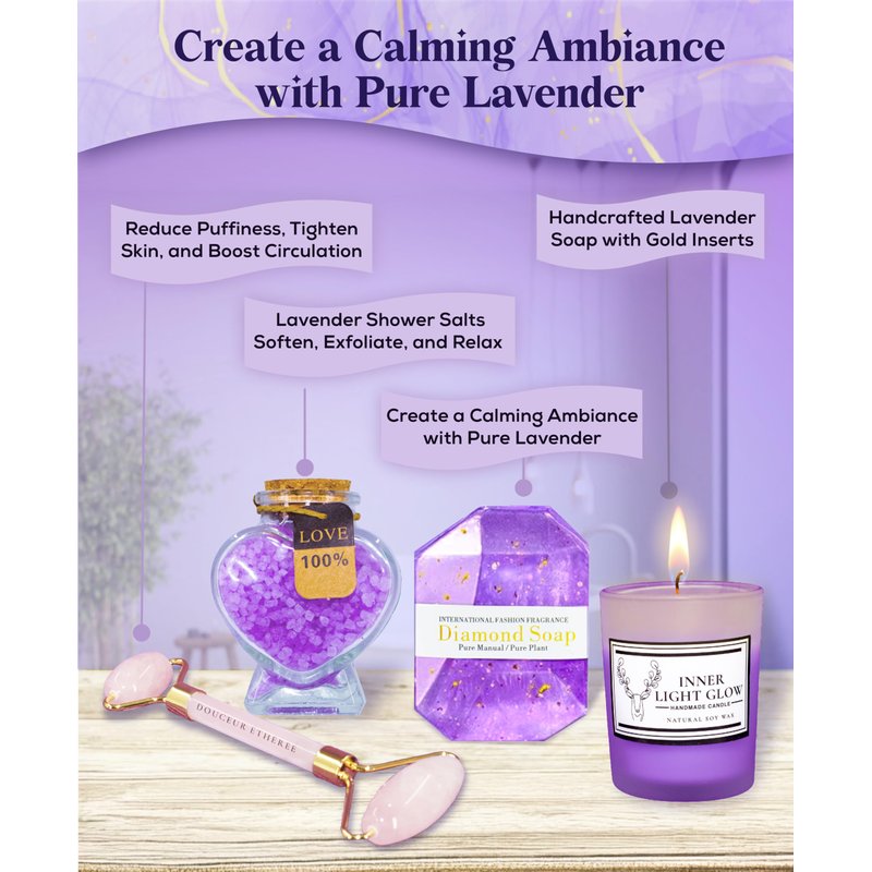 - Lavender-themed spa gift baskets for women. This curated gift set for women includes lavender infused self-care kit for calming body and refreshing skin