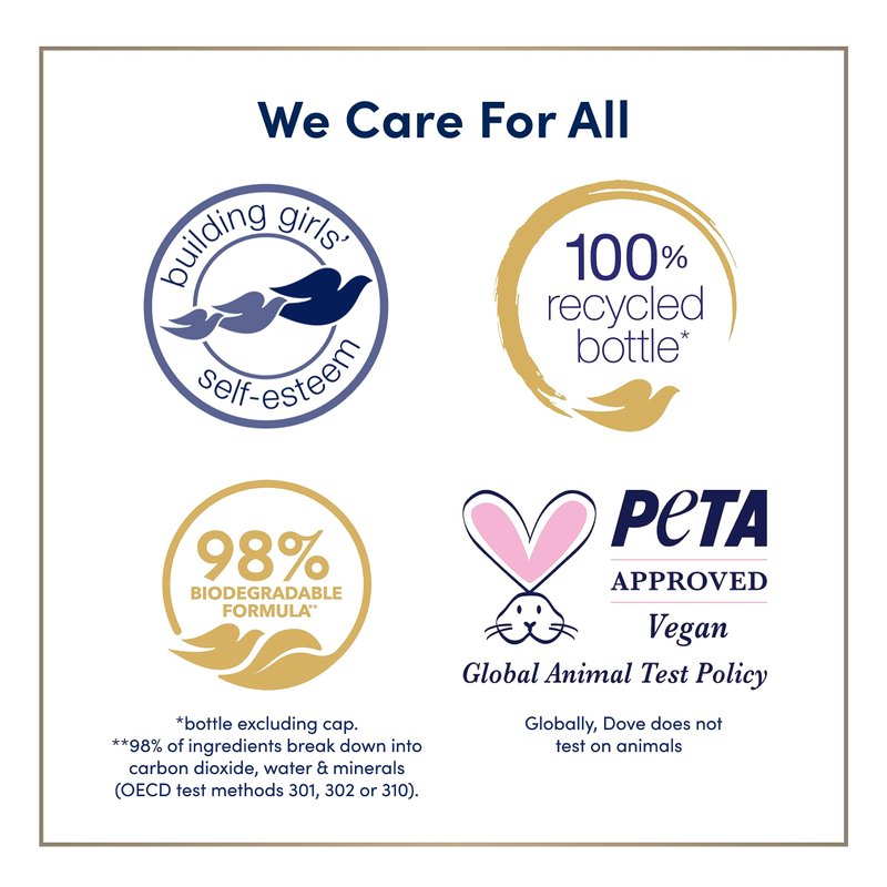 - THOUGHTFULLY MADE: This sulfate-free body wash is Certified Cruelty-Free by PETA, vegan, and is made in 100% recycled plastic bottles, so you can feel good about switching to Dove
