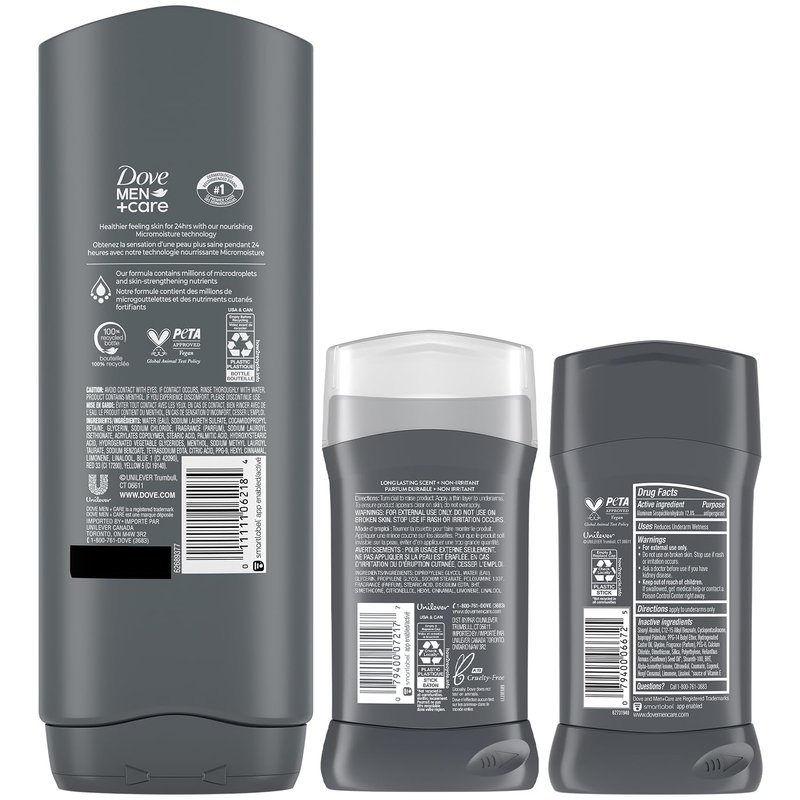 - DOVE MEN BODY CARE SET: This complete personal care bundle includes one each of the Dove Body Wash (18 Oz), Aluminum-Free Deodorant (3 Oz), and Antiperspirant for Men (2.7 Oz).