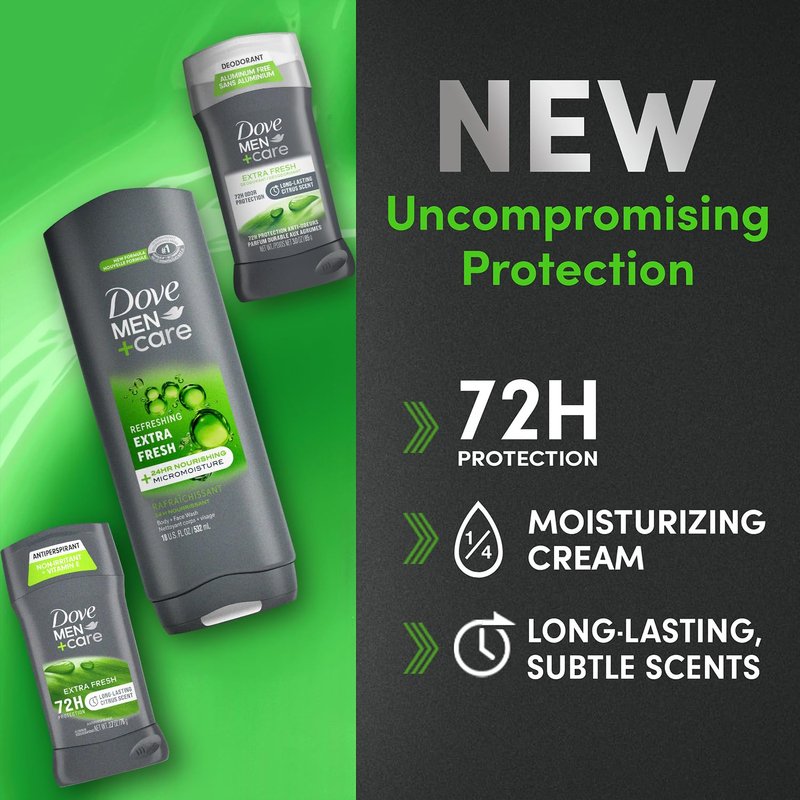 Dove Men + Care Extra Fresh Bundle – Men’s Body Wash, Aluminum-Free Deodorant + Antiperspirant, 72H Protection, Citrus Scent (3 Piece Set)
