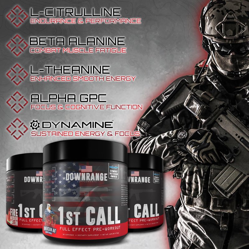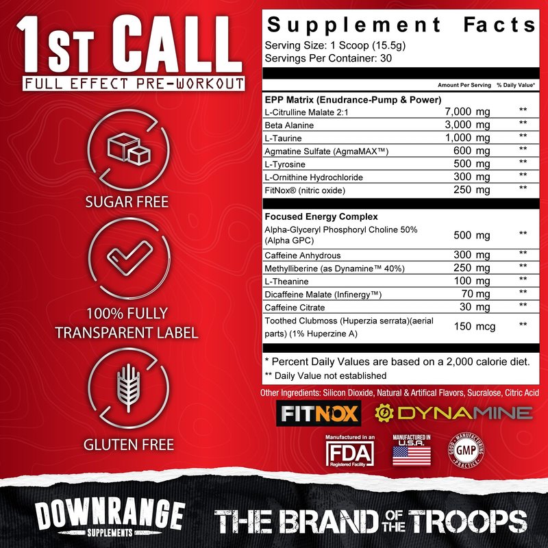 1st Call is a fully dosed pre workout formulated with a unique synergistic blend of scientifically researched compounds that will bring your focus and drive to the next level. Formulated for top operators and athletes, mission effectiveness is kept in the forefront of all product formulations. Which is why 1st Call is a great pre workout formula for everyone from the novice fitness enthusiast to die hard athletes and operators. Using all of the highest quality ingredients available to include 4 trademark compounds, your focus, muscular endurance and pump will bring every training session to a new level. So continually improve your fighting position with 1st Call today! No need to take anything extra for pump or endurance. This pre-workout is 3-in-1. Providing you will full dosages for energy, focus and pump. 1st Call was formulated to provide you with effective dosages in 4 main categories energy, endurance, pump and focus. 1st Call can also be taken at less than a full dosage for new users or individuals sensitive to caffeine and remain effective for endurance, pump and focus.