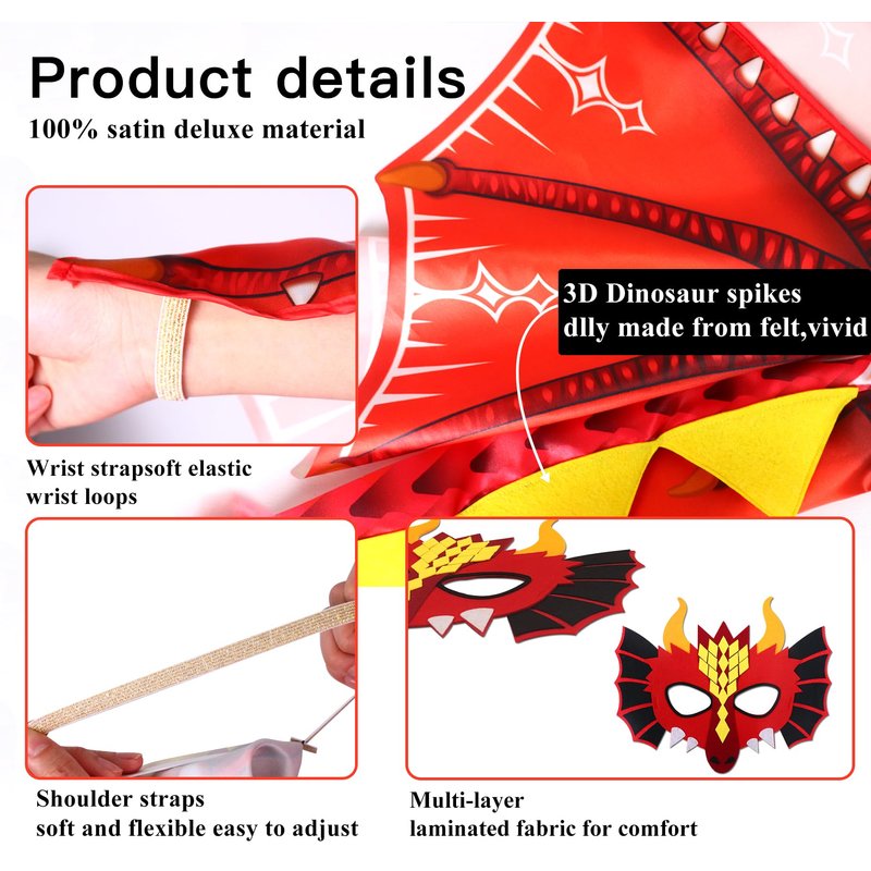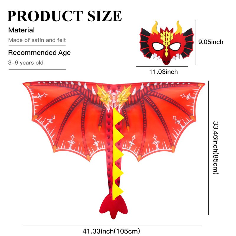 - Dinosaur Wings Costumes for Kids 3-8: Dinosaur costumes: Width 42.5’’Length 33.5’’; Dino masks: Width 9.84’’ Length 7.0’’; ensures a snug but not too tight fit. This dragon costume set, perfect for boys girls 3-8. with elastic straps, comfortable, and easier to fit most kids.