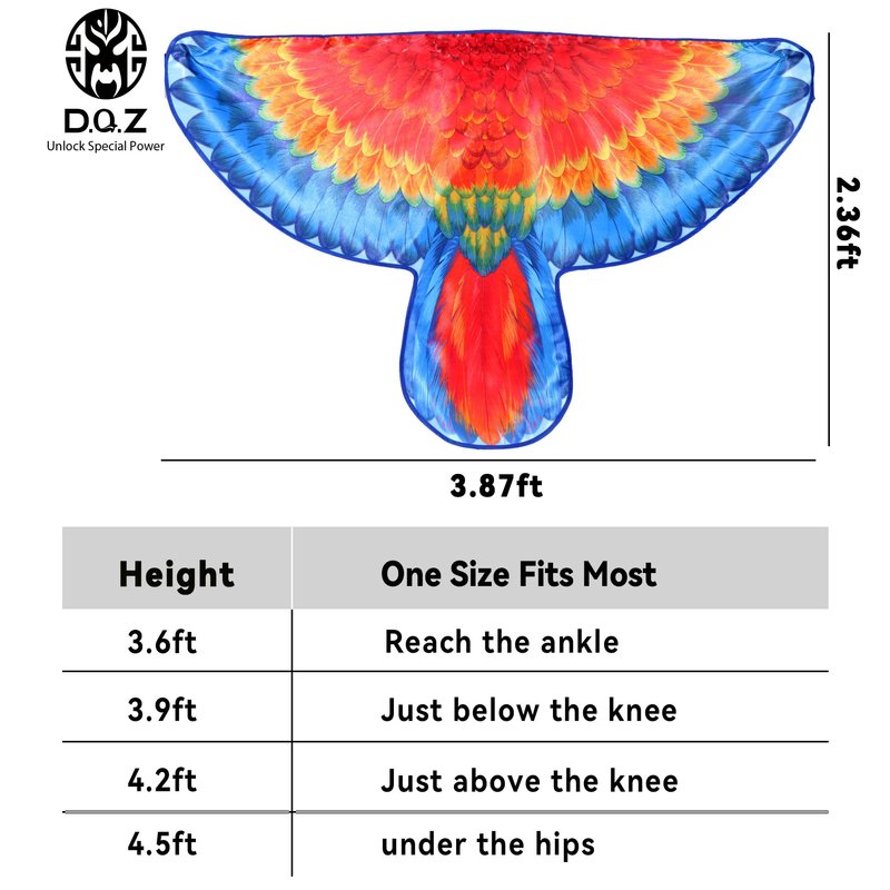 - Right Size: Kids bird wingspan: Width 44’’Length 28’’(includes 11.8’’ tail ), and elastic straps ensures a snug but not too tight fit, easier to fit . This bird wings costume set, perfect for over 3 yrs old kids.