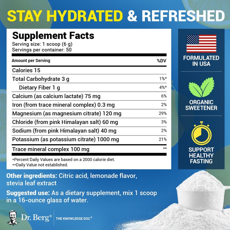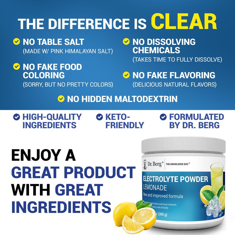 Dr. Berg's Original Keto Electrolytes Powder (50 Servings) - Sugar Free Electrolyte Powder - No Maltodextrin - Hydration Powder - Lemonade ๐๐ข๐ก๐ง๐๐๐ก๐ฆ ๐ ๐ข๐ฅ๐ ๐ฃ๐ข๐ง๐๐ฆ๐ฆ๐๐จ๐ ๐๐ก๐ ๐๐๐๐๐ง๐ฅ๐ข๐๐ฌ๐ง๐๐ฆ - This powder contains 13 times more potassium than common sports drinks to help you avoid symptoms like weakness, fatigue, constipation, sugar cravings and restlessness before sleep. Support your potassium levels without eating massive amounts of vegetables every day. ๐ญ๐๐ฅ๐ข ๐ฆ๐จ๐๐๐ฅ ๐๐ก๐ ๐ ๐๐๐ง๐ข๐๐๐ซ๐ง๐ฅ๐๐ก - Dr. Bergโs formula is designed to give your body only the substances that support you and your energy levels, all while keeping you in ketosis. No added sugars, carbs or maltodextrin. ๐ฃ๐ข๐ช๐๐ฅ ๐จ๐ฃ ๐ฌ๐ข๐จ๐ฅ ๐ฃ๐๐ฅ๐๐ข๐ฅ๐ ๐๐ก๐๐ - Shift your athletic endurance into higher gear! Electrolyte Powder helps you get ready for your next game or workout by replenishing and rejuvenating your cellular energy and providing needed hydration. It also helps restore your electrolyte balance and promotes energy recovery. ๐ฅ๐๐๐ฌ๐๐ฅ๐๐ง๐ ๐ฌ๐ข๐จ๐ฅ ๐๐๐๐๐ฆ - Packed with 3 times more potassium citrate for fast hydration, this unique formula alleviates muscle cramps and supports optimal muscle and nerve function. This electrifying combination supports energy levels all day long, from your tiniest cells to your full body. ๐๐ข๐ ๐ ๐๐ง๐ง๐๐ ๐ง๐ข ๐ฆ๐๐ง๐๐ฆ๐๐๐๐ง๐๐ข๐ก - If for any reason you're not happy with the results you experience within the first 30 days, weโre happy to give you a refund! Simply send us a message. The refund will be processed as long as it is requested within 30 days of purchase. There is no need to return the product to us!