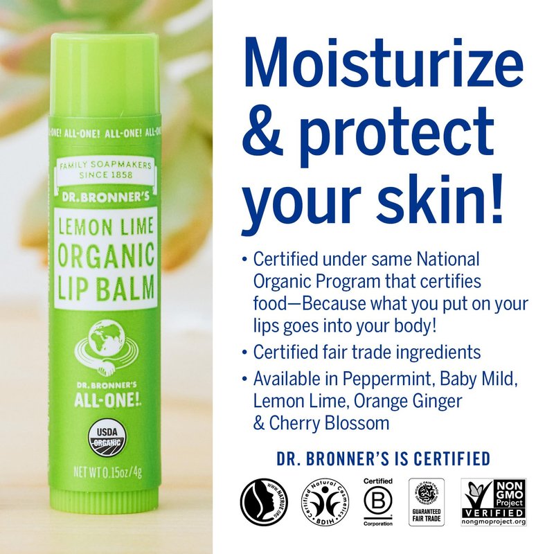 Dr. Bronners Organic Lip Balm is an organic lip balm, produced with organic beeswax and organic oils from jojoba, avocado and hemp to help with extra hydration.