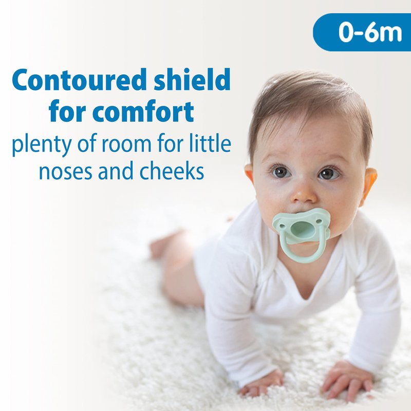 - CONTOURED COMFORTABLE SHIELD. The one-piece construction of the HappyPaci features a contoured butterfly-shaped shield for comfort. The shield curves away from baby’s face, providing plenty of room for little noses and cheeks.