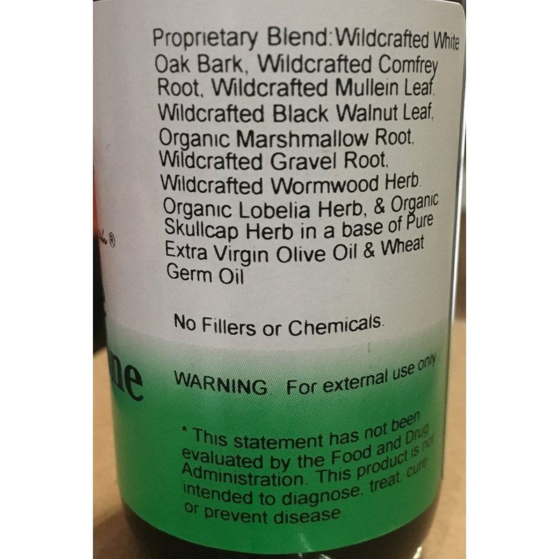 - Ingredients Extra Virgin Olive Oil Wheat Germ Oil White Oak Bark Comfrey Root Mullein Leaf Black Walnut Leaf Marshmallow Root Wormwood Herb Lobelia Herb Skullcap Herb Gravel Root
