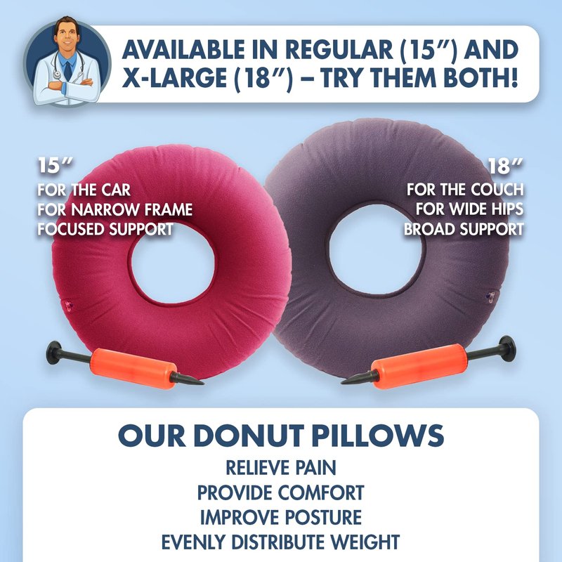 - Two Sizes For Fit And Travel: Our Donut Cushion comes in 15” and 18” models, because we know sometimes one size DOESN’T fit all. We recommend the smaller cushion for the office or travel - great for the car or airplane seats! The larger one is perfect for the couch, or for those with wider hips. Perfect for users who suffer from bedsores, new mothers with postpartum pain, or exceptionally uncomfortable office chairs. Can even be used when lying down in bed!