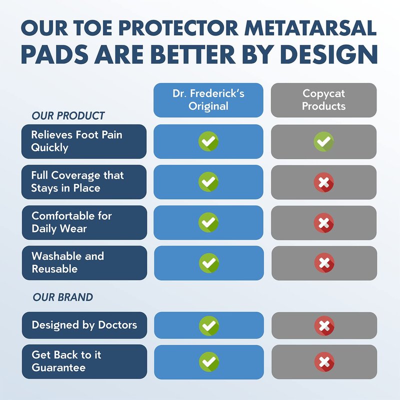 - Committed To Your Foot Care: At Dr. Frederick's Original, we prioritize creating products that cater to your foot care needs. If our Metatarsal Sleeves Plus don’t meet your expectations, please contact us for support in finding a suitable solution.