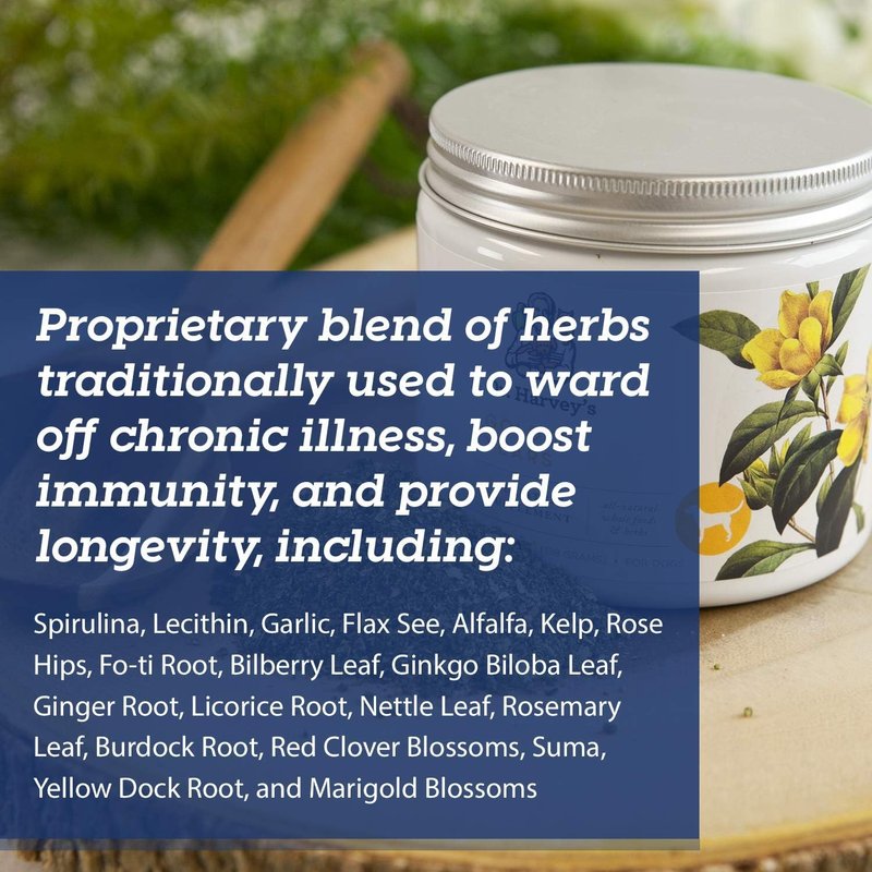 - Combination of nutritious whole foods and herbs that have been known to help the body to maintain its ability to fight disease and may help to increase longevity