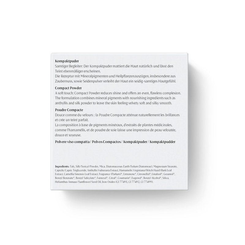 The lightest touch: Dr. Hauschka Compact Powder. So delicate yet so effective – our pressed powder compact perfects your complexion and sets your make-up. The transparent composition of mineral pigments blends naturally with the colour nuances of your skin and with your foundation, blush or corrector. Transparent finish blends with all skin tones.