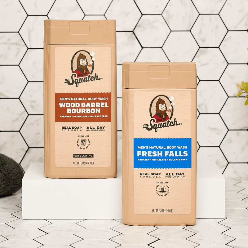 Natural body wash made from real soap, no really – Real Soap! Ditch that synthetic cleanser you call body wash and say hello to the natural liquid soap so epic it’ll instantly become your main squeeze. People have been asking us for years to create a natural body wash and now we finally have a formula worthy of the Dr. Squatch name! Our moisturizing formula cleans deep and is packed with nourishing, natural ingredients like Glycerin and a Coconut-derived cleanser for lavish lathers and satisfying scrubs. Available in four of our most popular unique, manly scents, this formula is free from Sulfates, Parabens, and Phthalates – plus it’s perfect for daily use on all skin types. Scents: Wood Barrel Bourbon - An old fashioned blend of spice, bourbon, and oak. Fresh Falls - Refreshing and clean with a hint of citrus.