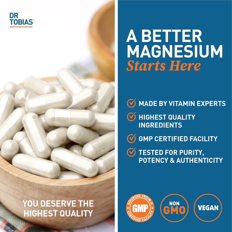 Magnesium is an incredible mineral known for its calming properties. It is one of seven essential macrominerals (alongside calcium, phosphorus, sodium, potassium, chloride and sulfur) which people need to consume in relatively large amounts (at least 100 mg per day) in order to maintain optimal health and vitality. Many adults are deficient in Magnesium either because it is difficult to maintain a diet with enough of this nutrient or because of other factors that can decrease the body's magnesium levels, including poor digestion, stress or taking certain medications. Muscle cramping, fatigue, difficulty sleeping, and food cravings are just a few of the consequences associated with ongoing magnesium deficiency. The health benefits of maintaining consistent magnesium levels are abundant. Dr Tobias Magnesium Bisglycinate is a premium quality magnesium complex supplement containing 200 mg Buffered Chelate Complex in each capsule. Our buffered chelate complex is easy on the digestive tract and ensures optimal absorption in a comparison to other forms like magnesium citrate, or malate. Take 1 to 2 capsules per day to support energy levels, muscles, bones, digestion, and overall health. At Dr. Tobias we take pride in offering the highest quality ingredients and expert formulas. Our Magnesium capsules are non-GMO and made with care by our vitamin experts in a facility that follows GMP (Good Manufacturing Process) guidelines in the USA. Our mission is to encourage people to become the best version of themselves; whether you're looking for improved digestive health, a joint support supplement, cleanse or detox, we have a nutritional supplement or daily vitamin to help you get there. Customer satisfaction is our top priority. We all want to feel our best, achieve our goals, live our dreams and love who we see in the mirror. Great health is within reach! A Better You Starts Here.