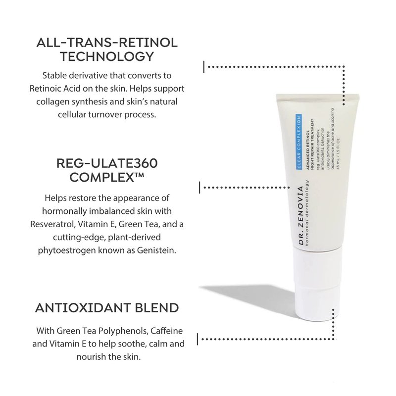 This clinically-formulated Advanced Night Repair Treatment with Retinol works overnight to support skin’s natural cellular repair process and help reduce the appearance of acne and acne scarring. Featuring highly concentrated All-Trans-Retinol Technology, this breakthrough repair treatment helps support collagen synthesis and deeply penetrates the epidermis through a unique micro-polymer delivery system to support cellular turnover. Enhanced with Dr. Zenovia’s signature REG-ulate360 Complex which works synergistically with a powerful Antioxidant Complex to help protect skin’s barrier, the appearance of acne, acne scars, texture and tone is visibly improved.