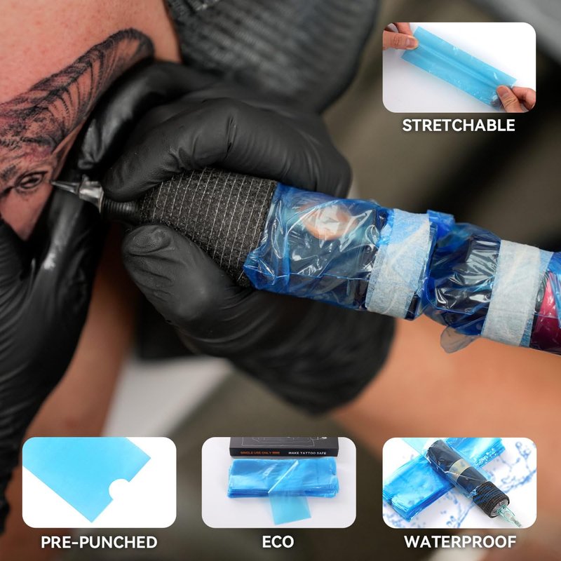 Dragoart 200Pcs Tattoo Machine Covers, PMU Machine Covers Tattoo Supplies PMU Supplies Disposable Clear Plastic Tattoo Gun Wrap Tattoo Pen Covers Tattoo Grip Wrap Sleeves(Blue 2.09 inch x 6.45 inch)