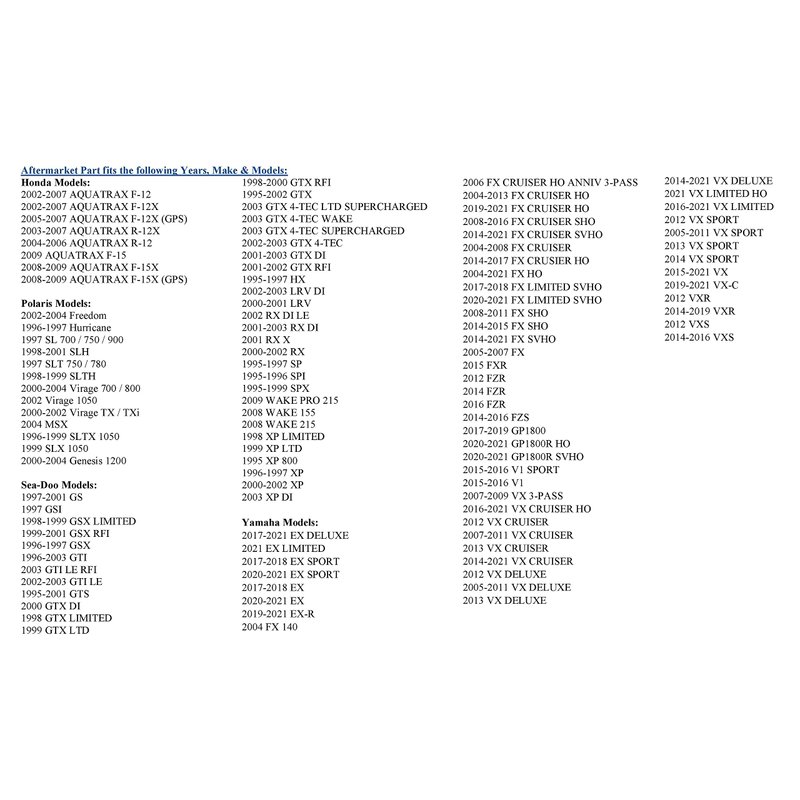 - Replaces Polaris OEM Part Number: 1060125 ~ Also Replaces the following Part Numbers: Honda: 74810-HW1-730, 74810-HW1-670 / Seadoo: 292000685, 292000187 / Yamaha: F1S-U2280-00-00, F1S-U2280-02-00 / WSM #: 011-158