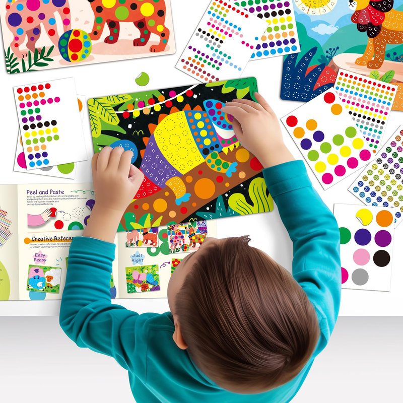 - Peel, Paste, Create: Watch your child's creativity soar as they peel and paste colorful dot stickers onto our canvases, bringing vibrant animal worlds to life!