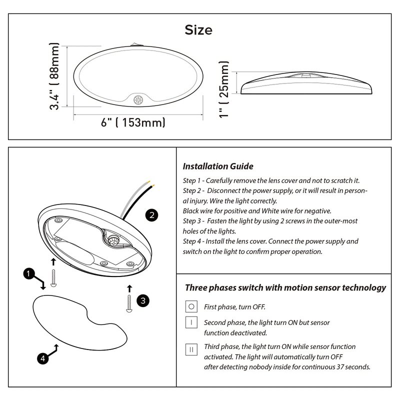 Brand new addition to our dome light series! Equipped with a combination of advanced LED technology and motion sensor technology, this is a smart light for interior lighting. Its concise and compact design will look good in your vehicle. When the light is on, it looks even better. It features a motion sensor function. When it is activated, the light will automatically turn off when detecting nobody around for continuous 37 seconds. It is very user-friendly. You can also manually turn on the light.
