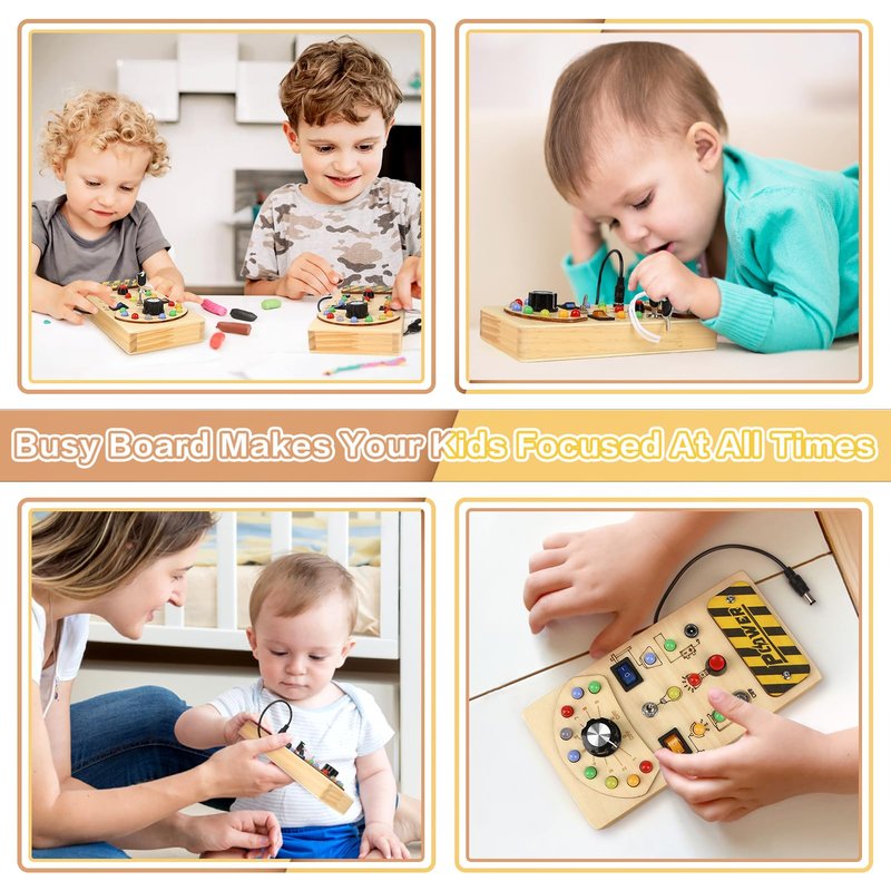 - Montessori Busy Board: This busy board features 7 style switches and 15 LED lights with diverse switches and colorful lights. Rich content brings more fun to young children and will keep them busy for hours! Requires 2 AAA batteries (not included).