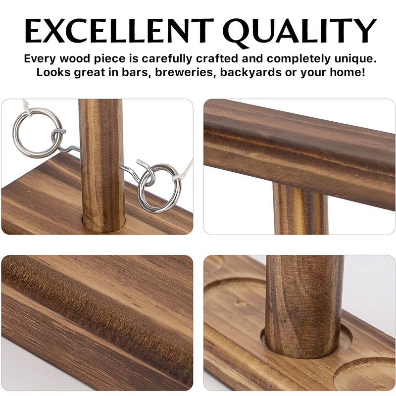- FUN GAME: Place wooden cup in the center circle, Take rings and go! Each time you land the hook, move the wooden cup 1 space towards your opponent. Player wins when the wooden cup moves off the end of the ladder. Play every game Style by agreeing on a wager with your competitor before the game.