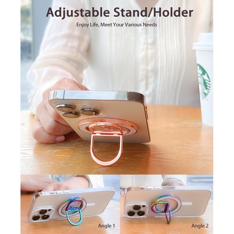 - High-Quality Zinc Alloy with a Fashionable Edge: Built from durable zinc alloy with a transparent, flashing accent, this magnetic phone ring holder for magsafe combines sleek design with high-end durability. It integrating all the functions of a cell phone ring and a cell phone grip, and can easily switch between three different modes of use, allowing you to play with your phone more easily.